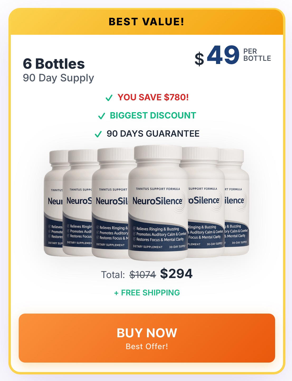 I loved it so much I ordered more bottles with the bonus offers — NeuroSilence truly delivers. It’s an all-natural formula, made in an FDA-registered, GMP-certified facility, with no harmful chemicals or side effects. If you’re tired of that constant ringing and mental exhaustion, NeuroSilence is the real solution. Experience peace naturally — or get every penny back.